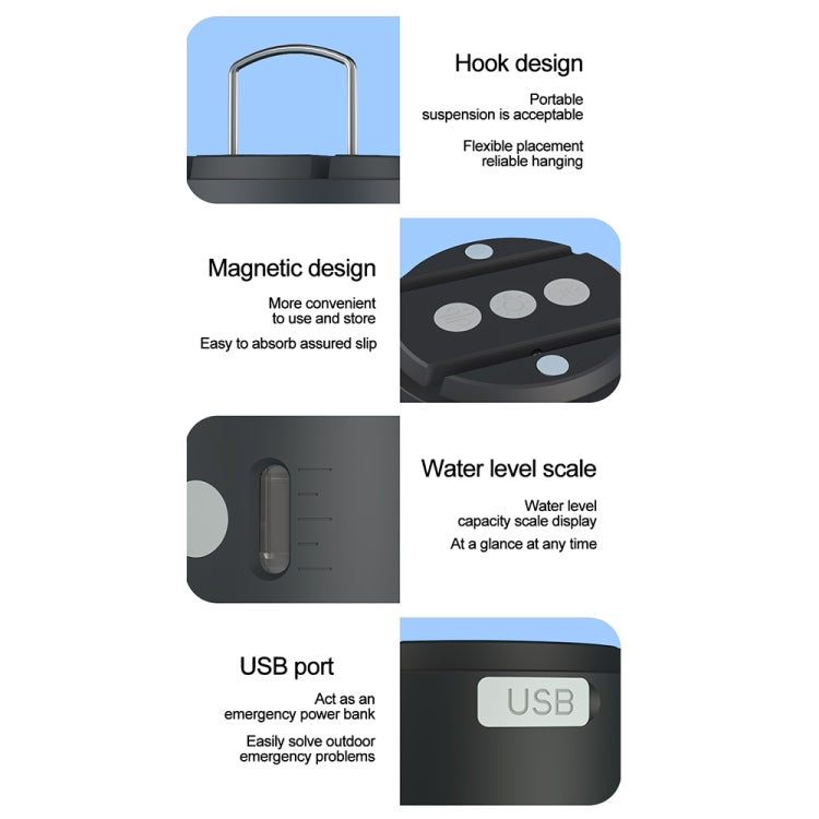 1. The camping lamp is made of high-quality stainless steel and ABS. It contains multiple functions such as lighting, fan, spray, USB charging, magnetic base and foldable suspension. It is very suitable for camping trips.