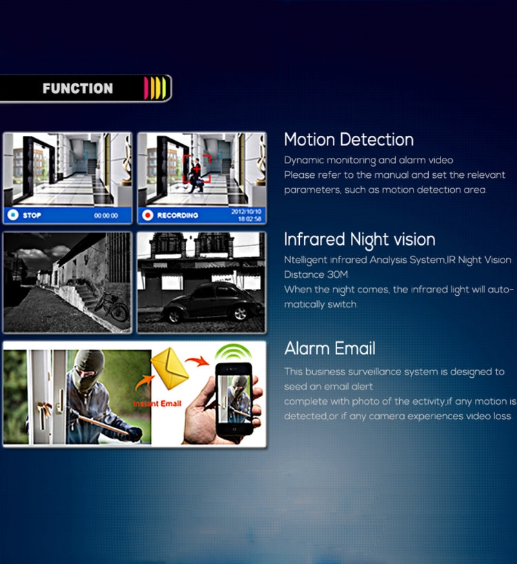 9. Network: Powerful network services (support DHCP, PPPOE, FTP, DNS, DDNS, EMAIL, IP searches etc.) And perfect support (WEB, Client, SDK), easy to achieve interoperability.