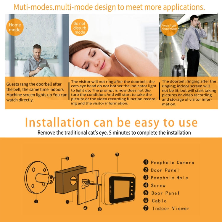 1. Danmini intelligent Peephole Viewer creat the new century.It is the last line of home security.Without destroying the door structure under the premise of the existing use of the peephole, no drilling, no wiring, can be used after installation. The product is equipped with intelligent operating system with humanized multi-mode design. Simple and convenient for the elderly and children. For your home security escort.