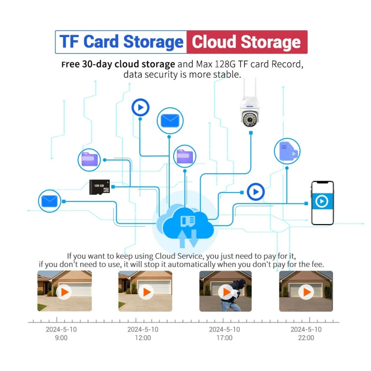7. Support cloud storage(30 days free), up to 128G memory card.