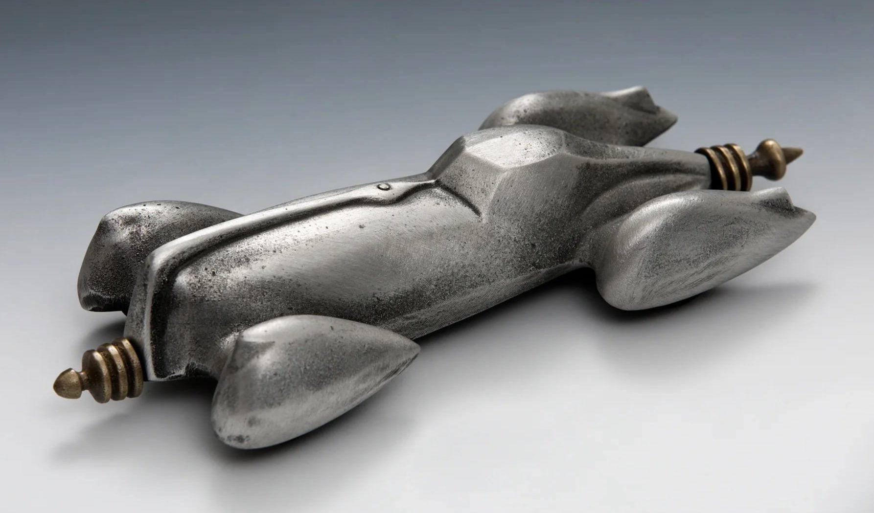 Race to the future and beyond in your very own "Future Car," sand-cast by Scott Nelles in his studio / foundry in Elk Rapids, Michigan. Includes four fixed wheels that actually spin.