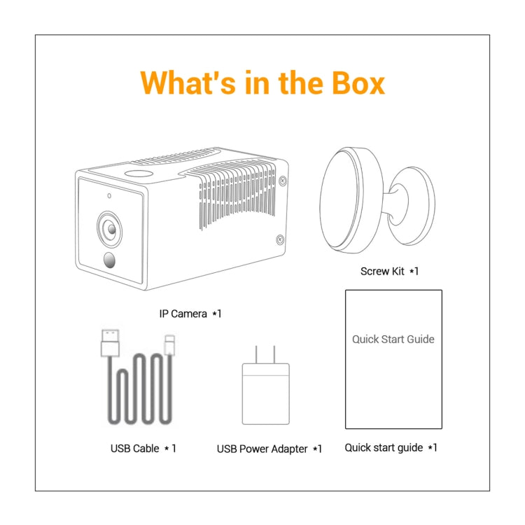 1 x Camera 1 x USB Cable 1 x User Manual 1 x Power Charger 1 x Screws Set |