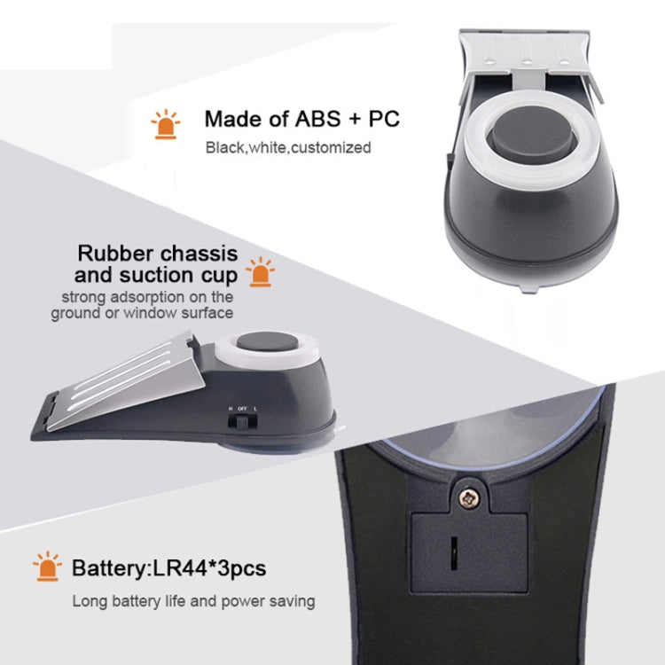 5. Door block alarm: stuck the tip of the product in the gap between the door and the floor, and press the product down to let the suction cup and the floor suck together. Someone cannot open the door from the outside. When someone pushes the door, The product will emit a 125 decibel alarm sound with flashing red warning light