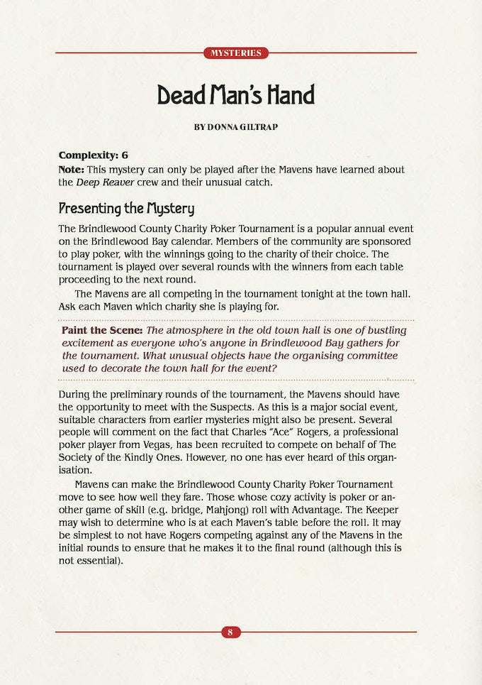 Nephews in Peril contains everything you need to expand the world of Brindlewood Bay and to add variety to your campaign. It starts with the Town of Brindlewood Bay, an extensive exploration of the game's setting, including important characters, locations, and historical details.