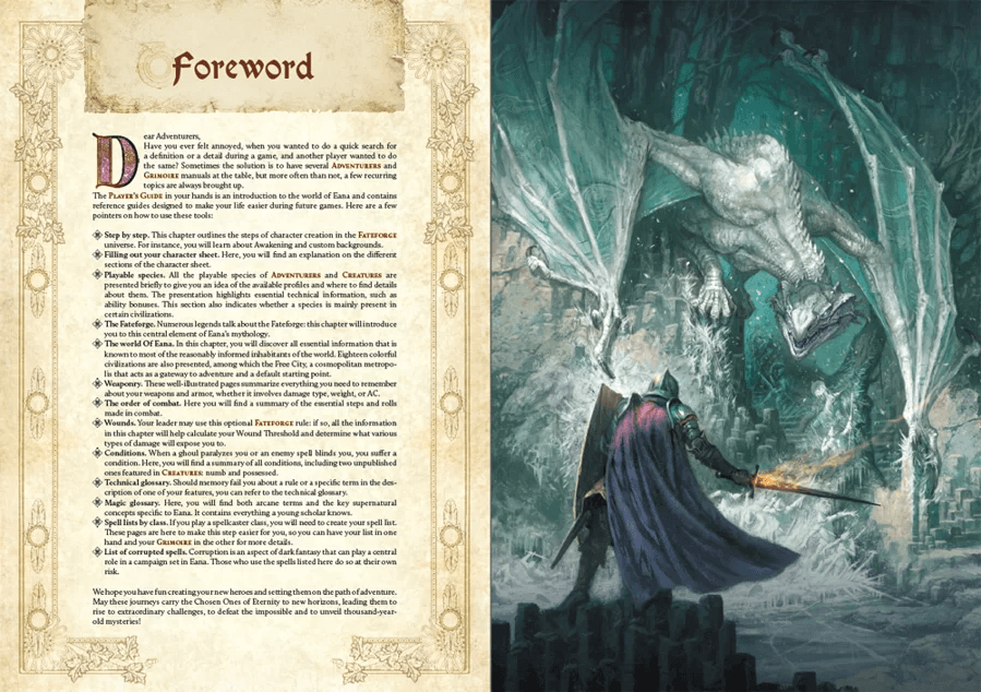 The Player's Guide is an accessory for Fateforge players. Inside this 90-page booklet you will find essential rules and reminders about the setting, such as: