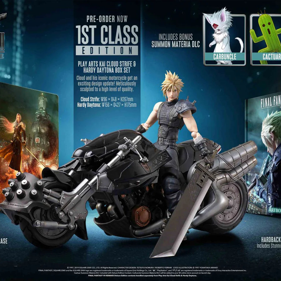 Included in the FINAL FANTASY® VII REMAKE 1ST CLASS EDITION, is protagonist Cloud and the Hardy Daytona as PLAY ARTS KAI action figures! This limited-quantity, large-format action figure set is the only way you can get both Cloud and the Hardy-Daytona together.